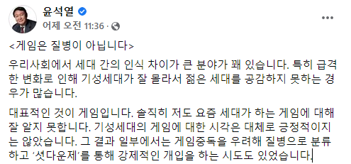 윤석열 대선후보는 지난 2일 자신의 페이스북을 통해 ‘게임은 질병이 아닙니다’라는 제목으로 글을 올렸다. 그는 “급격한 변화로 인해 기성세대가 잘 몰라서 젊은 세대를 공감하지 못하는 경우가 많다. 대표적인 것이 게임이다. 솔직히 저도 요즘 세대가 하는 게임에 대해 잘 알지 못한다”라며 “하지만 요즘 세대는 집이나 PC방에서 온라인 게임을 하는 것이 가장 대중적인 취미생활이 됐다. ‘페이커’ 등 유명 e스포츠 선수는 야구, 축구 선수보다도 더 많은 연봉을 받는 선망의 대상이 됐다”라며 글을 시작했다.