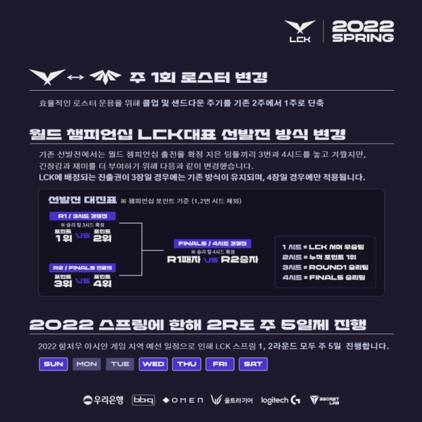 스프링 시즌에 한해 경기 일정이 조정된다. 정규 리그 2라운드까지 주 5일 운영된다. 경기 일정은 수요일부터 일요일까지다. 따라서 10주 동안 진행됐던 정규 리그는 스프링 시즌만 9주로 단축 진행된다. 이밖에 포스트시즌과 결승까지 일정도 조정될 것으로 전망된다.