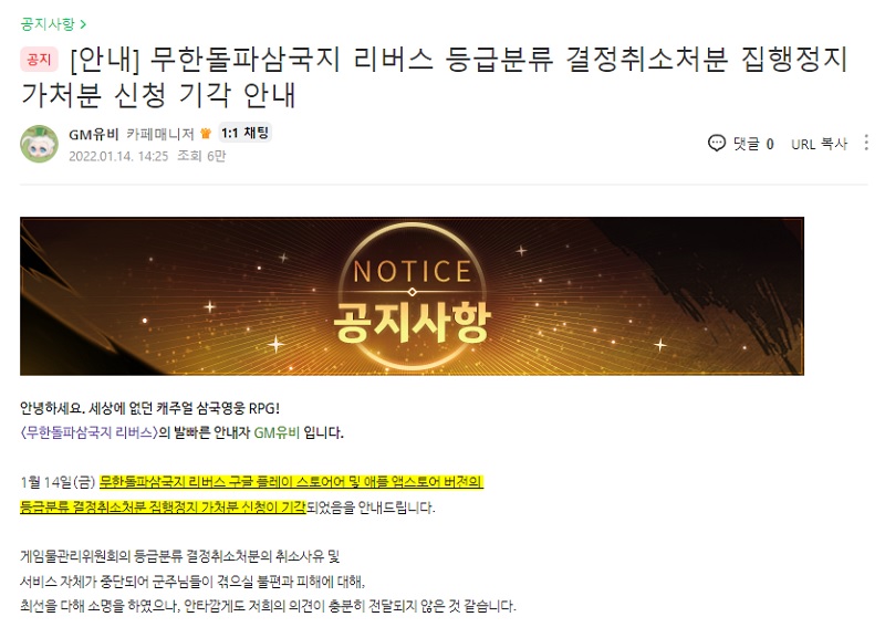 등급분류가 취소됐다가 법원으로부터 효력정지 처분을 받아 서비스를 재개했던 ‘무한돌파삼국지 리버스’(이하 무돌 리버스)가 다시 퇴출됐다.