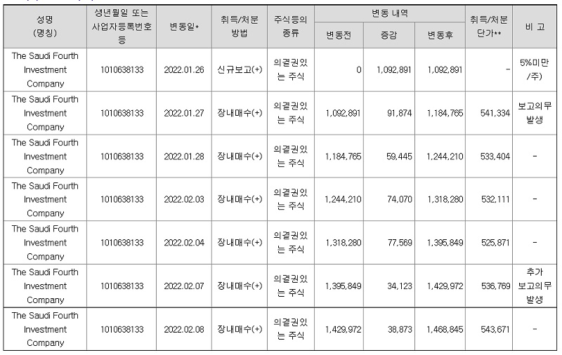PIF는 지난 1월 26일을 시작으로 매일 꾸준히 주식을 매수해온 것으로 나타났다. 첫 날에 109만 주를 사들였지만 5%가 되지 않아 보고 의무가 발생하지 않았다. 하지만 그 이후 매일 주식을 사들이면서 공시 보고의무가 발생했고, 9일에 공식 발표한 것이다.