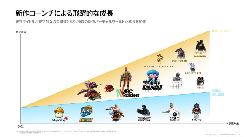 5개 업체는 2022년에 다양한 신작과 블록체인 게임으로 승부수를 던진다. 라인업이 가장 눈에 띄는 업체는 넥슨이다. 넥슨은 2021년에 다양한 장르의 신작을 출시한다. 이미 2월 15일에 PC 온라인 게임 ‘커츠펠’을 출시했고, 3월 24일에는 모바일 게임 ‘던전앤파이터 모바일’을 출시한다. 이외에도 ‘카트라이더: 드리프트’, ‘마비노기 모바일’, ‘DNF DUEL’, ‘아크 레이더스’ 등의 신작이 콘솔, PC, 모바일 등으로 출시된다. 레이싱 게임, RPG, 대전 격투 등 장르도 다양하다. 넥슨은 2020년부터 본격적인 체질 개선에 들어갔다 보니, 2021년에는 상대적으로 적은 신작이 출시됐었다. 하지만, 2022년부터는 그 동안 개발되고 있던 신작이 본격적으로 출시된다.