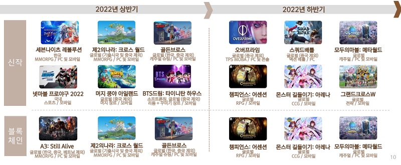넷마블도 2022년에 다양한 신작을 준비 중이다. ‘세븐나이츠 레볼루션’, ‘제2의 나라’ 글로벌 버전, ‘머지 쿵야 아일랜드’, ‘BTS드림: 타이니탄 하우스’, ‘넷마블 프로야구 2022’, ‘A3: 스틸얼라이브’ 글로벌 버전 등이 상반기에 출시된다. 하반기에는 ‘오버프라임’, ‘스쿼드배틀’, ‘모두의마블: 메타월드, ‘챔피언스: 어센션’, ‘몬스터 길들이기: 아레나’, ‘그랜드크로스W’가 출시된다. 이중에는 ‘몬스터 길들이기: 아레나’, ‘모두의마블: 메타월드’, ‘챔피언스: 어센션’ 등 6종의 블록체인 게임도 포함됐다.