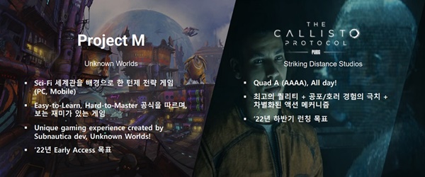 크래프톤은 2022년에 신작 4종을 선보이는 것을 목표로 준비 중이다. 그 중에서 가장 주목을 받는 것은 언노운 월즈가 개발하는 ‘프로젝트M’과 스트라이킹 디스턴스 스튜디오가 개발하는 ‘칼리스토 프로토콜’이다. 또한, ‘로드 투 발러: 엠파이어즈’와 ‘디펜스더비’를 상반기에 시범 출시(소프트 런칭)할 예정이다.