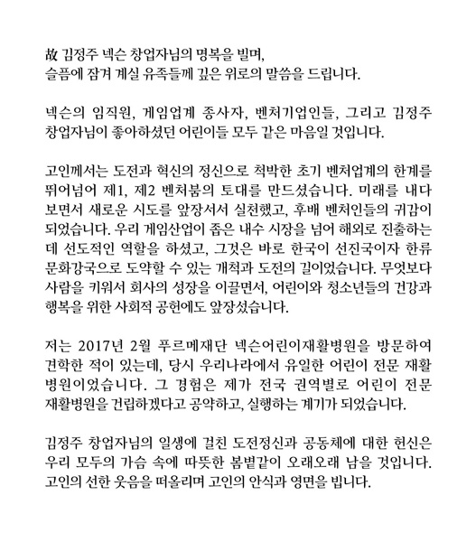 마지막으로 문재인 대통령은 “김정주 창업자님의 일생에 걸친 도전정신과 공동체에 대한 헌신은 우리 모두의 가슴 속에 따뜻한 봄볕같이 오래오래 남을 것입니다. 고인의 선한 웃음을 떠올리며 고인의 안식과 영면을 빕니다”라고 전했다.