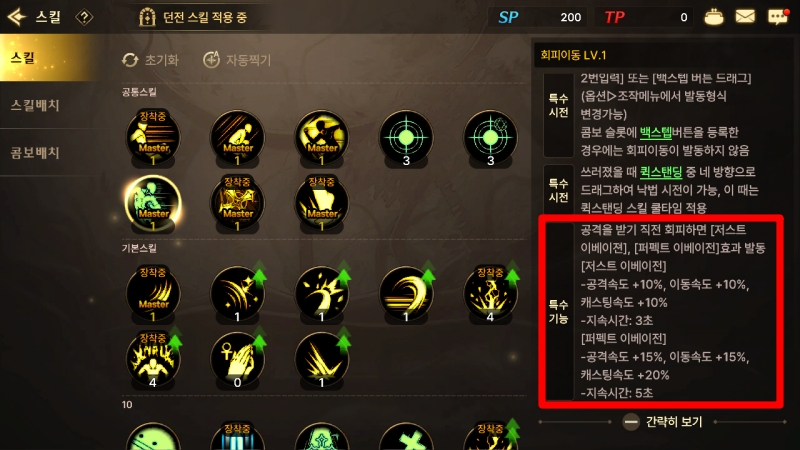 회피이동의 존재가치는 또 있다. 바로 스킬 사용 뒤에 따라붙는 딜레이(혹은 경직, 이하 후딜레이) 캔슬이다. 회피이동은 모든 행동에서 가능하고, 우선순위가 가장 높다. 일반적으로 사용 취소가 불가능한 스킬도 회피이동으로 강제 취소가 된다. 따라서 캐릭터의 딜 사이클이나 경직을 줄이는 하나의 테크닉으로 활용할 수 있다. 적의 공격을 아슬아슬하게 피하면 3~5초간 각종 속도가 오르는 이베이전 버프도 받을 수 있으니, 채널링 스킬을 통한 카운터와 버프 획득 역시 던전 플레이의 중요한 조작 중 하나라 할 수 있다.