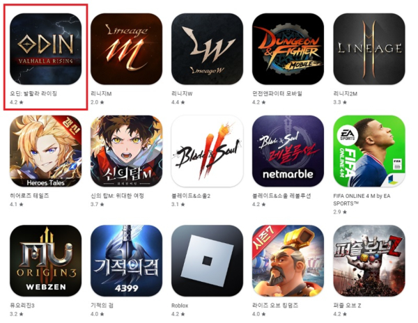 작년 6월 출시한 ‘오딘’은 양대 마켓 매출 순위에서 최상위권을 4년 간 점령했던 ‘리니지’ 형제를 밀어내고 1위를 차지했고. 출시 6개월 만에 매출 5천억 원을 돌파했다. 그리고 작년 11월까지 1위를 유지하다가 자연스럽게 1위 자리를 내준 바 있다.
