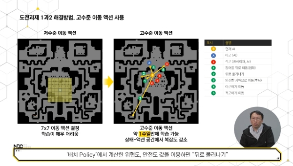 구체적으로는 캐릭터의 이동과 관련된 배치 폴리시(Policy)와 전투 폴리시로 수준을 나눴다. 여기에 사냥터의 주요 지점과 고수준의 이동 결정 등 다양한 방법으로 부족한 부분과 학습 속도를 높였다. 이때, 보상을 최대화하기 위해 APC가 부자연스러운 행동을 한다면, 기획자의 의도대로 움직이도록 강제하며, 이를 위한 도구와 툴 개발이 필요할 수 있다고 덧붙였다.