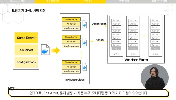 학습과정에서도 문제가 발생했다. 폭발적인 트레픽을 처리해야했고, APC가 의도대로 잘 행동하고 있는지 모니터링도 필요했다. ‘리니지’의 빠른 업데이트 주기도 문제 중 하나였다. 한 개발자는 AI 프레임워크(Framework)를 이용해 콘텐츠 개발에 생산성과 안정성을 확보했다고 설명했다. 이어 윈도우 컨테이너(Windows Container) 기반으로 대규모 AI 학습환경을 구축하면 업데이트, 문제 발생 시 자동 복구, 모니터링 등 여러 이점이 있다고 추천했다. 무엇보다 학습 속도를 높일 수 있다는 강점을 강조했다. 이밖에 이슈 탐지 도구로 치명적인 이슈를 자동 탐지하는 방법을 도입해 효율적인 모니터링이 가능했다는 경험을 공유했다.