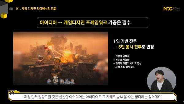 신선한 아이디어는 재미를 담보할 수 없다. 게임 디자인의 프레임워크 가공 작업이 뒤 따라야 한다. ‘니케’는 초기 버전에서 1인 기반 전투로 진행됐던 ‘니케’는 현재 5인 동시 전투로 변경됐다. 전투의 치열함과 난이도 조정, 모바일 환경에서 발생하는 조작 문제 등을 개선하는 변화다. 이어 신선하다 혹은 새롭다는 긍정적인 평가를 경계하라는 조언을 덧붙였다.