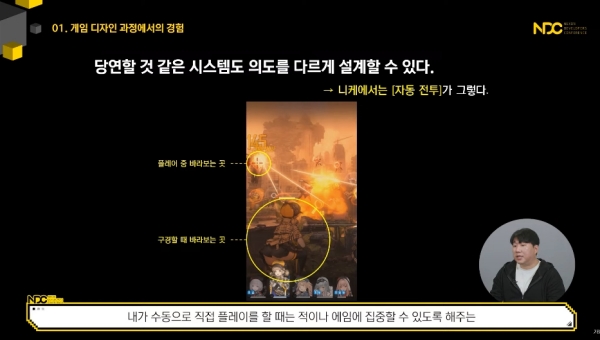 이밖에도 많은 변화가 개발 기간 중에 적용됐다. 모바일 기기 사용과 전투 피로도를 줄이는 방안이 먼저 소개됐다. 그는 RPG의 플레이 호흡 구축 방식을 ‘니케’에 적용함으로써 피로가 쌓이는 것을 방지했다. 캐릭터 스킬 사용 시간도 특수한 조건에 의해서 발동되도록 개선해 긴장의 이완과 수축 구간을 배분했다.