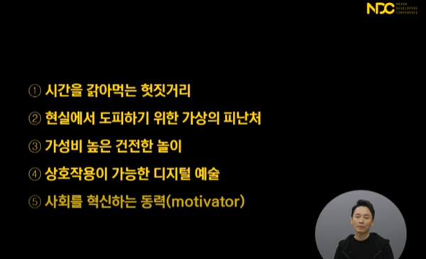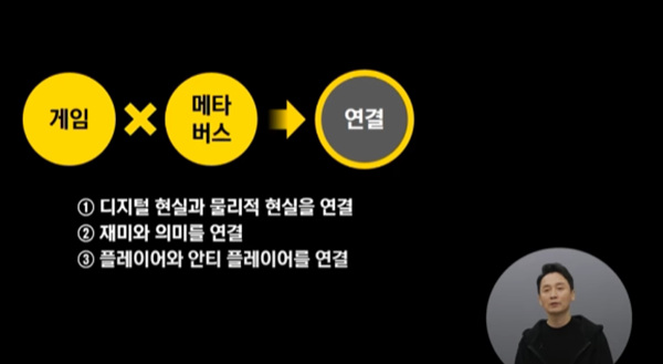 최근에는 게임이 메타버스와 많이 언급된다. 메타버스는 간단하게 정의하자면 ‘디지털 현실’이다. 게임은 메타버스(디지털 현실)의 한 종류 중 하나다. 메타버스를 통해 게임을 즐기지 않던 사람들도 디지털 세계에 익숙해지고 있다. 이를 통해 게임 유저와 일반인이 연결된다.