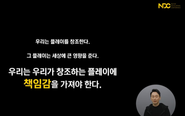 게임 개발자는 ‘플레이’를 만든다. 이 ‘플레이’는 세상에 큰 영향을 준다. 그래서 개발자가 창조하는 ‘플레이’에 책임감을 가질 필요가 있다. 그는 마지막으로 “우리가 만드는 플레이가 과연 사람들을 무의미한 행복으로 몰아넣는 그런 경험인지, 디지털 현실을 통해 우리가 좀 더 강해질 수 있는, 좀 더 커다란 행복을 줄 수 있는 무언가를 만들고 있는 것인지 함께 생각을 해보자”라고 말했다.