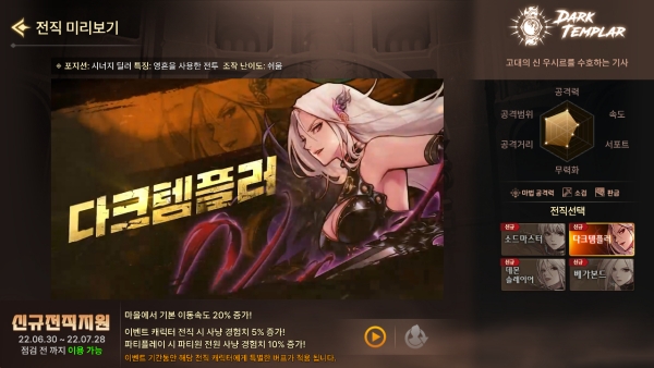 다크템플러는 적의 움직임을 묶는 홀딩에 기술이 포함됐다. 암속성을 기반으로 넓은 판정을 가진 공격기술이 많아 사냥이 쾌적하다. 직업 패시브로 적의 방어력을 줄이는 능력을 보유해 파티 플레이에서 진가를 발휘한다. 반면, 스킬 연계가 단조롭고 느려서 메인 딜러의 역할을 수행하기에는 부적합하다. 일반 던전 파밍과 파티 플레이, 레이드를 즐기는 유저에게 적합한 클래스라고 할 수 있다.