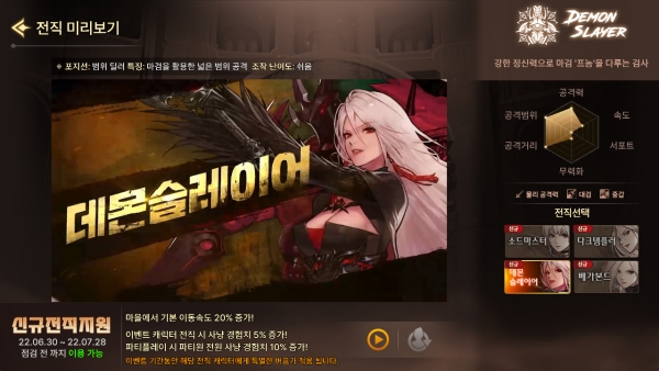 데몬슬레이어는 많은 히트수가 강점인 캐릭터다. 스킬 공격범위가 넓어 쾌적한 사냥이 가능하다. 다단히트 기반의 스킬이 많아 아이템이 갖춰지면 높은 공격력을 뽐낸다. 주무기는 물리 대미지가 가장 높은 대검이 추천된다. 단, 육성단계에서는 대검과 스킬의 역경직 때문에 답답할 수 있다. 또, 채널링 스킬이 많아 백스탭을 잘 활용해야 한다.