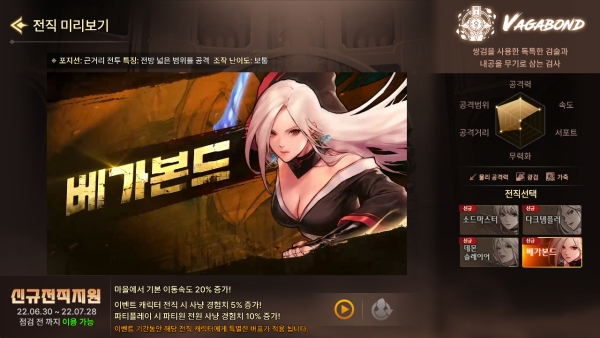 베가본드는 속도와 범위 측면에서 가장 경쾌한 클래스다. 공격속도가 빠른 광검을 주무기로 각종 장법을 무협풍 캐릭터다. 스킬을 사용하는 방법에 따라 적을 모으거나, 공격을 중단하는 식의 플레이도 가능하다. 단점은 광검의 낮은 공격력을 보완하기 위한 아이템 세팅이 필요하다는 점이다.