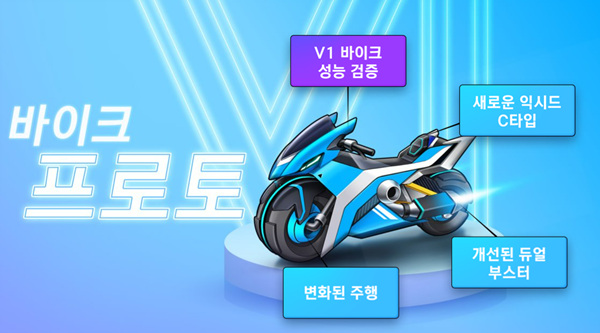 신규 프로토 바이크는 4륜과 바이크 시대 속 공존을 위해 새로운 익시드 타입을 기반으로 변화된 주행과 개선된 듀얼 부스터를 탑재했다. 프로토라는 이름에 걸맞게 테스트를 위해 출시된 바이크이며, 유저들의 의견을 받아 성능 검증을 거치며 만들어 나갈 계획이다.