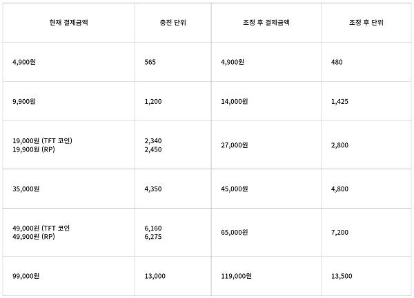 이에 따라 결제 금액과 충전되는 단위에 변동이 생긴다. 기존에 4,900원을 내면 565 RP가 충전됐지만, 이제는 480 RP가 충전되며 18% 인상된다. 즉, 1 RP가 기존에는 최대 8.67원이었지만, 이제는 최대 10.2원으로 오른다.