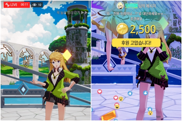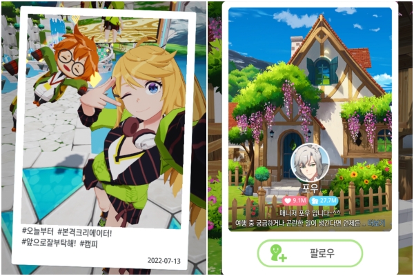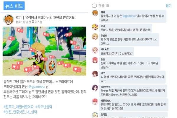 그래서 다른 유저와 소통하는 소셜 네트워크 기능도 다양하게 갖췄다. 유저가 달성하거나 활동한 내용은 포스팅되어 뉴스피드에 등록되고, 여기에 좋아요와 댓글이 달린다. 다른 유저들을 팔로우하거나 내가 다른 유저를 팔로우할 수 있다. 라이브 스트리밍을 통해 다른 유저에게 후원도 받는 모습도 포착된다. 게임을 하며 얻게 되는 키워드는 해시태그 형식으로 저장된다.