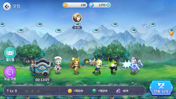 방치형 요소는 바로 보급품 지원이다. 모험 버튼을 누르면 아래에 파티가 전투를 하고 있는 모습이 보이는데, 비서인 루시의 레벨에 따라 시간 당 얻을 수 있는 골드와 경험치석, 돌파 경험치석이 높아진다. 그리고 게임을 하며 점점 이 보상이 쌓이고, 메인에 있는 보급품 획득을 얻을 수 있게 된다.