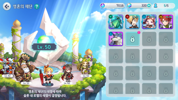 여기서 눈에 띄는 부분은 일부 캐릭터만 키워지는 부분을 보완하기 위한 ‘영혼의 제단’ 기능이다. 가장 강한 로벨 5명 중 제일 낮은 레벨의 로벨을 기준으로, 제단에 레벨이 낮은 로벨을 올리면 레벨이 공유되며 상승한데. 제일 낮은 레벨이 50이라면, 제단에 올리는 로벨은 모두 50이 되는 것이다. 단, 제단에서 내려가면 레벨은 다시 원래대로 돌아간다.