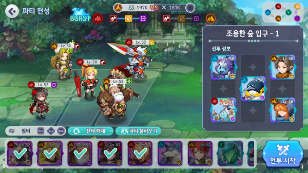 하지만 이 게임은 메인 전투가 방치형이 아니다. 스테이지를 선택해 전투를 시작하고, 스킬 사용에 유저가 개입을 할 수 있다. 또한 매 스테이지마다 캐릭터와 배치를 바꾸는 등 전략 RPG의 스타일을 갖고 있는 것이다.
