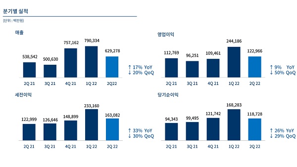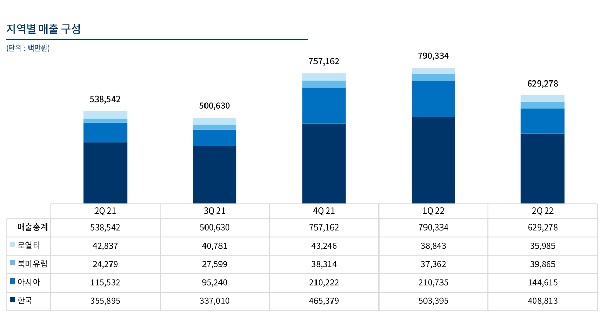 지역별 매출에서는 한국이 4,088억 원으로 전분기대비 19% 감소했고 아시아 지역이 1,446억 원으로 감소했다. 반면 북미/유럽은 398억 원으로 소폭 증가했다.