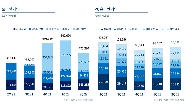 2분기 매출 중 모바일 게임은 4,752억 원으로 전분기대비 26% 감소한 것 전년동기대비 35% 증가한 것으로 나타났다. ‘리니지W’가 2,236억 원으로 전분기 대비 40% 감소했지만 누적 매출 1조원을 돌파했다.