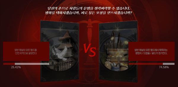 ▲필드 채널 규칙 ▲PK 페널티 규칙 ▲부활 규칙 등을 유저 스스로 투표를 통해 결정하는 것이다. 예컨대 게임 중 캐릭터가 사망했을 경우 ‘부활 대기 시간 없이 마을에서 부활’하는 방식과 ‘비용을 소모해 제자리에서 부활’ 하는 것 중 하나에 투표권을 행사할 수 있다.