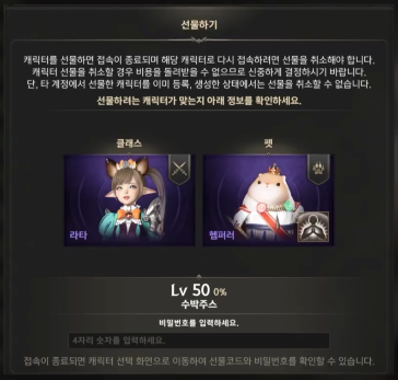 선물 방식도 간단하다. 선물코드와 비밀코드를 확인해 선물 받을 유저에게 전달하면 된다. 선물 받을 유저는 선물코드와 비밀코드를 입력하고, 캐릭터명을 새로 입력하면 선물 받을 캐릭터를 온전히 자신의 것으로 만들 수 있다.