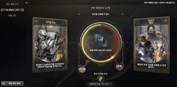 론칭 시점에는 일반 채널의 모든 필드 내 PK 가능여부, 다른 유저를 처치한 이용자가 받을 처벌 방법, 캐릭터 부활 방식을 놓고 투표가 진행된다. 경험치, 아이템 드롭률 등 획득 가능한 가치가 바뀌고, 다른 유저를 대하는 방식이 바뀌는 등 한순간의 선택에 따라 세상이 바뀌게 된다. 뿐만 아니라 향후 새로운 규칙이 추가되어 보다 선택과 변화의 폭이 넓어질 예정이다.