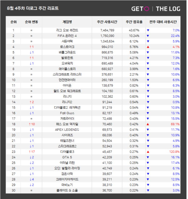 ‘패스 오브 엑자일’은 신규 시즌 효과가 지속되며 전주대비 사용시간이 69.1% 증가하며 10계단 오른 18위를 기록했고, ‘디아블로3’ 역시 신규 시즌인 27시즌 ‘빛의 부름’ 공개로 전주대비 사용시간이 120.8% 증가해 17계단 상승한 23위를 차지했다.