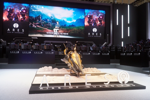 부스 가운데는 ‘아레스’ 체험대로 꾸며졌다. 게임 속에 등장하는 거대한 바이크 조형물은 현장을 찾은 유저의 기념사진 명소가 될 것으로 보인다. 체험존은 스마트폰과 PC 버전을 즐길 수 있는 체험대가 뒤편에 마련됐다.