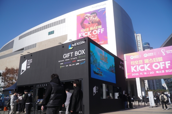 게임쇼를 즐기는 방법은 다양하다. 신작을 한발 먼저 즐기는 체험 기회는 물론, 양손 가득 캐릭터 상품(굿즈)을 챙기는 것도 쏠쏠한 재미다. 넥슨은 지난 17일, 부산 벡스코에서 열린 지스타 야외 전시장에서 관람객에게 푸짐한 상품을 전달하는 야외부스를 운영하고 있다. 체험을 끝낸 유저를 환송하기 위해 마련된 부스다.