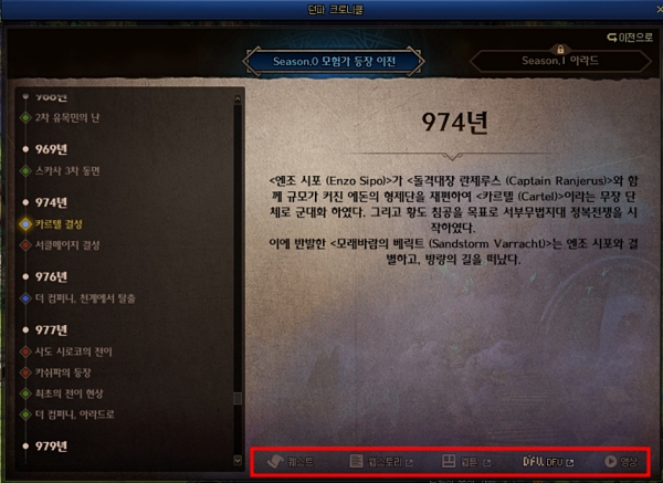 던파 크로니클은 모험가 이전 시대부터 현재까지 이야기를 알기 쉽게 정리한 신규 콘텐츠다. 다양한 매체를 통해 강화해온 세계관을 재정리하는 연표의 역할도 한다. 또한, 서비스 초기부터 공개된 웹스토리(소설), 웹툰과 만화, 던파 유니버스(DFU) 사이트 자료, 영상까지 다양한 외부 매체를 쉽게 확인할 수 있도록 돕는다. 이렇게 분산된 콘텐츠와 이야기를 연결하는 가교이자 연대기로 기획된 콘텐츠라 할 수 있다.