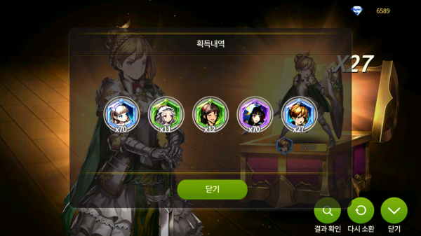 참고로 이 게임은 일정량의 소울스톤을 모으면 캐릭터 획득이 가능하다. 그리고 이 게임의 주요 비즈니스 모델은 용병 뽑기인데, 용병의 소울스톤을 뽑을 수 있다. 그리고 그 숫자는 랜덤하게 반영된다. 그래서 적게는 10개, 많게는 70개의 소울스톤을 뽑기에서 얻을 수 있다.