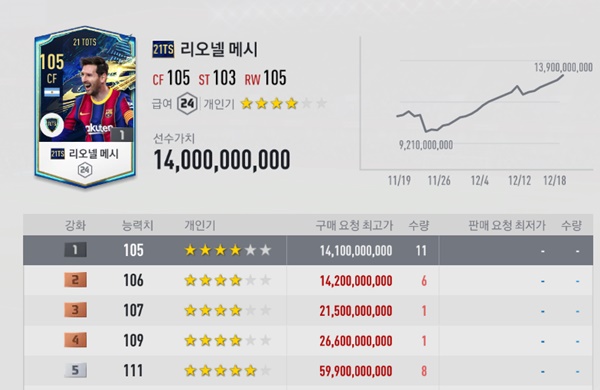 게다가 ‘피파온라인4’는 월드컵을 맞아 PC방 점유율 2위를 계속 유지하고 있을 정도로 유저가 많이 몰렸다. 이렇게 유저가 많이 몰린 상태에서 눈부신 활약을 보여준 선수의 가치는 더 올라가기 마련이다. 그 결과로 메시 선수 카드 중 뛰어난 성능을 가진 카드들은 월드컵 기간 동안 가치가 꾸준히 상승했다.