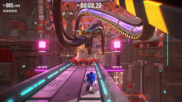 빠르게 진행되는 이동 구간은 카메라가 자연스럽게 다음 타깃을 보여줘 대비하기 쉽다. 조작 측면에서 전반적인 유저 경험(UX)이 대단히 수준 높아졌다고 느낀 부분이다. 단, 소닉의 상징인 360도 루프 구간과 같은 곳에서는 움직임을 조명해 다음 장애물을 파악하지 못하게 가리기도 한다. 이를 개발의도로 볼지는 유저마다 다를 수 있다. 개인적으로는 이런 연출 자체가 난이도를 높이기 위한 수단으로 느껴졌다.