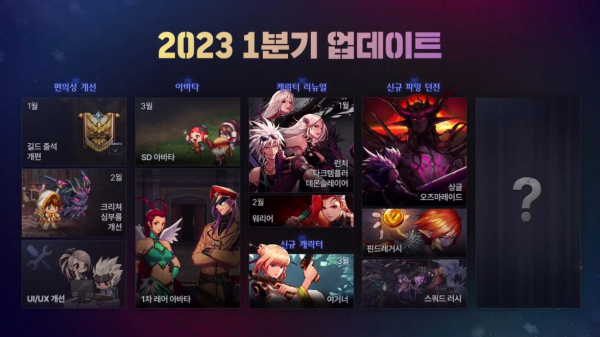 오는 2023년 1분기에는 ▲길드 출석 개편 ▲크리처 심부름 개선 ▲UI/UX개선 ▲SD 아바타 ▲1차 레어 아바타 ▲캐릭터 리뉴얼 ▲신규 캐릭터 여거너 ▲신규 파밍 던전(싱글 오즈마 레이드, 핀드레거시, 스쿼드 러시 등이 순서대로 추가된다.
