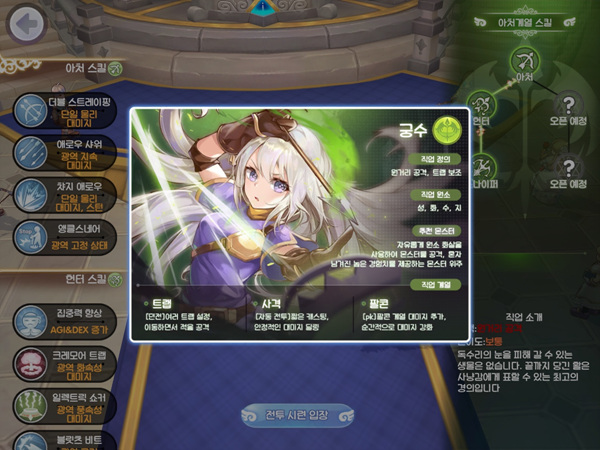 우선, 초보자나 무과금 유저에게는 궁수와 마법사가 가장 좋다. 두 직업 모두 사정 거리가 길어서 초반에 사냥할 때 편하기도 하다. 그리고 일반 사냥에서는 다양한 속성을 활용할 수 있는 직업이 좋은데, 궁수와 마법사는 초반부터 다양한 속성을 잘 활용할 수 있기 때문이다. 궁수는 상점에서 속성 화살을 구매할 수 있고, 마법사는 다양한 속성 기술을 보유하고 있다. 특히 마법사의 전직 위저드는 사냥에서 효율이 매우 높은 것으로 평가 받고 있다. 다만, 마법사는 능력치가 낮은 초반에는 기술을 사용하는 속도가 다소 느리다. 만약 시원시원하고 빠른 공격을 원한다면 궁수가 더 좋다.