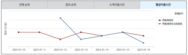 전체 시간에서 차이가 나는 것은 ‘드리프트’가 아직 정식 서비스가 아니기에, 최고속도가 제한되어 있어 기존 유저에게는 상당히 속도감이 낮게 느껴지기 때문인 것으로 보인다. 게다가 원작의 서비스 종료가 약 한 달 반 정도 남은 만큼, 원작을 즐기던 기존 유저들은 서비스 종료 전까지 게임을 즐기려는 니즈가 상당한 것으로 나타났다.
