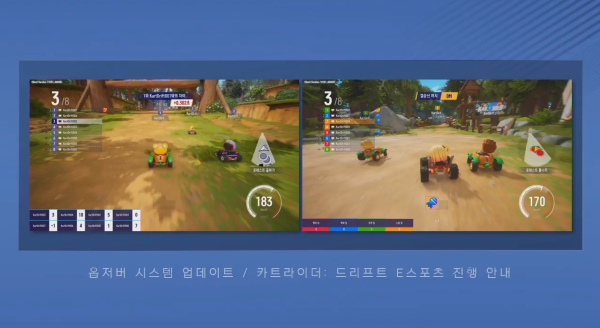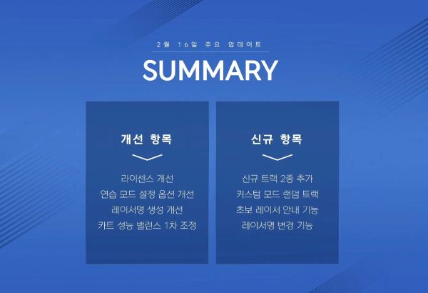 다음으로 연습 모드에서 AI가 아닌 레이서만 매칭하는 옵션이 추가되고, 옵션의 안내 가이드가 추가된다. 그리고 레이서명 변경 기능 도입과 레이서명 생성 시 재확인 후 생성되도록 개선하고, 카트의 성능에 대한 조정이 진행돼 밸런스를 맞춘다.