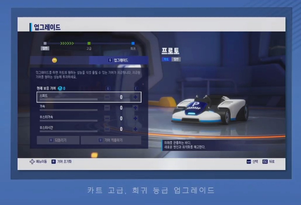 그리고 카트 업그레이드 시스템이 추가된다. 스피드와 가속, 부스터가속, 부스터시간 등 원하는 부분을 업그레이드할 수 있고, 강화에는 루찌만 필요하며 카트 등급은 고급, 희귀 등급까지 올릴 수 있다.