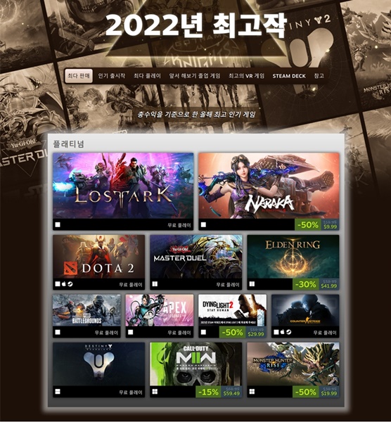 ‘로스트아크’는 최근 스팀에서 동시접속자 수 20~30만 명을 유지하고 있다. 지난 1월에는 ‘2022년 스팀 최고의 게임’의 ‘최다 판매’, ‘인기 출시작’, ‘최다 플레이’ 부문에서 최우수(플래티넘) 그룹으로 선정됐다. 한국 업체가 개발한 PC MMORPG가 서양에서 이 정도 성과를 거두는 것은 이례적인 일이다. 당시에 ‘로스트아크’는 ‘엘든링’, ‘콜 오브 듀티: 모던 워페어2’ 같은 유명 게임과 어깨를 나란히 했다.