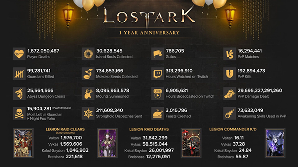 ‘로스트아크’를 서양에 서비스하는 아마존게임즈는 출시 1주년을 맞아 기념 영상과 인포그래픽을 공개했다. 인포그래픽에는 다양한 기록이 포함되어 있다. 지금까지 유저들이 사망한 횟수는 16억 회를 돌파했고, 만들어진 길드의 수는 78만 개가 넘어갔다. 게임 방송 플랫폼 트위치에서의 시청 시간은 3억 시간을 돌파했다. 이외에도 PVP가 진행된 횟수, PVP에서 유저가 사망한 횟수, 어비스 던전 완료 횟수 등 다양한 기록이 공개됐다.