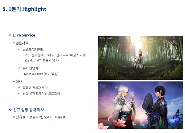 올해 펄어비스는 기존 IP의 안정적인 서비스를 이어가면서 신규 IP 준비에 최선을 다 한다는 계획이다. ‘검은사막’ IP에서는 신규 클래스와 신규 지역 ‘아침의 나라’ 등을 선보이고, ‘이브 온라인’에서는 중국어 간체차와 신규 유저 트레이닝 프로그램을 추가하는 등 장기 로드맵을 구축한다. ‘붉은사막’은 올 하반기중 개발 완료를 목표로 개발에 전념하고 있고, 글로벌 파트너사와 공동 마케팅 논의가 진행 중이다.