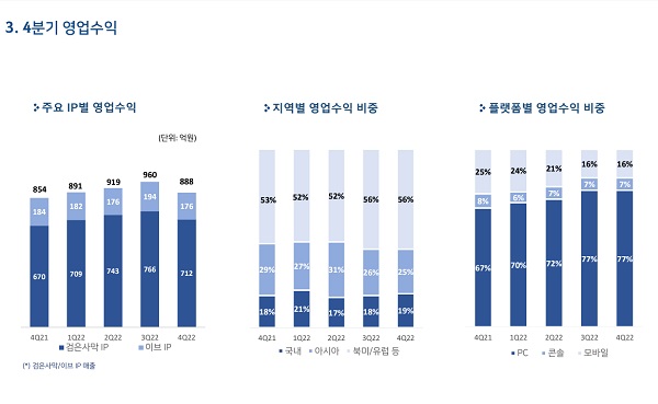 지역별 매출을 보면, 국내 매출은 19%를 차지했고, 아시아 지역 매출은 25%를 차지했다. 북미/유럽 지역 매출은 56%를 차지하며 해외 매출 비중이 81%를 차지했다. 플랫폼별 매출에서는 PC 플랫폼이 77%, 모바일 플랫폼은 16%를 기록했고, 콘솔 플랫폼은 7%를 차지하며 전분기 수준을 유지했다.