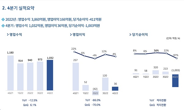 이를 합한 2022년 연간 실적은 매출 3,860억 원으로 전년 대비 4.3% 감소했고, 영업이익은 166억 원으로 전년 대비 61.4% 감소했다. 당기순손실은 411억 원으로 적자 전환했다.