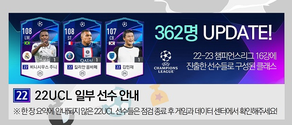 넥슨이 한국에 서비스하는 축구 게임 ‘피파온라인4’가 신규 선수 카드 ‘22UCL’를 추가했다. 22UCL 카드는 22-23 UEFA 챔피언스리그 16강 진출팀 선수들로 구성됐다. 선수들의 능력치는 앞으로 UEFA 챔피언스리그에서의 활약에 따라서 최대 4회 조정될 수 있다. UEFA 챔피언스리그가 종료되면 각 선수들의 능력치가 확정된다.