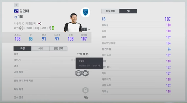 이 중에서 눈에 띄는 것은 김민재 선수의 능력치다. 이번에 추가된 중앙 수비수(CB) 중에서는 가장 높은 종합 능력치(107)를 보유했다. 수비수에게 중요한 몸싸움, 속력, 점프, 태클, 대인수비, 헤더, 가로채기 등이 모두 105~110이다. 게다가 부상을 잘 당하지 않는 특성을 보유했고, 코너킥 상황에서 유용한 ‘파워 헤더’도 갖췄다. 이 정도면 누구나 탐낼만한 주전급 중앙 수비수라고 볼 수 있다. 게다가 짧은 패스와 볼 컨트롤도 뛰어나기에, 상황에 따라서는 공격적으로 기용하는 것도 가능하다.