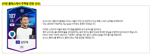 한편, UCL 22에서 가장 주목 받는 선수 중 한 명은 바로 나폴리의 김민재 선수다. 김민재 선수는 22 UCL 클래스의 수비수 중에서 가장 높은 능력치인 107을 부여 받았다. 속도, 몸싸움, 태클 등 수비수에게 중요한 능력치가 모두 상위권이다. 여기에 부상을 잘 당하지 않는 특성과, 강력한 헤더를 할 수 있는 ‘파워 헤더’라는 특성도 있다. 만약 김민재 선수가 UCL 8강, 4강, 결승까지 진출해서 좋은 활약을 선보이면 능력치가 더 올라갈 수 있는 가능성도 있다.